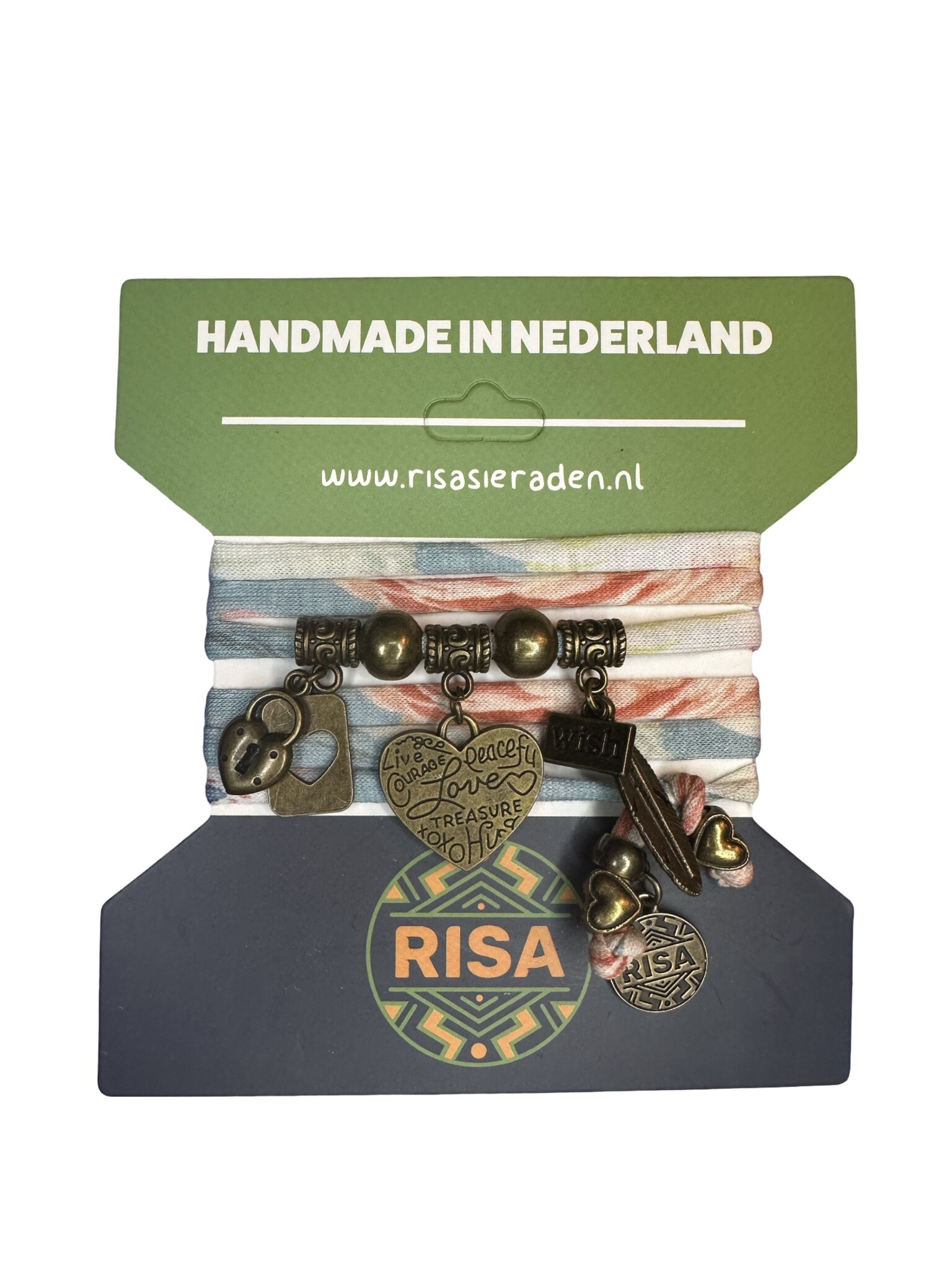 Wikkelarmband gemaakt van gerecycled katoen met bronzen bedels in het thema Peaceful Love. De kleur van het bandje is multicolor.